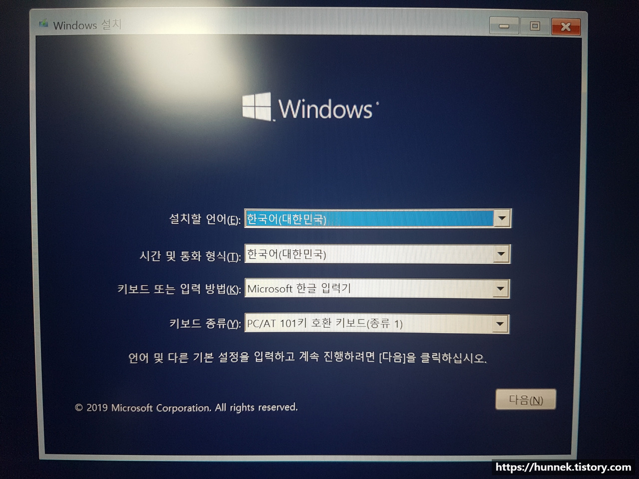 5. 노트북을 재부팅하면 USB를 통해 Window 설치 파일이 실행됩니다. 이때, Window 설치 과정을 따라가며, 노트북에 Window 운영체제를 설치합니다.