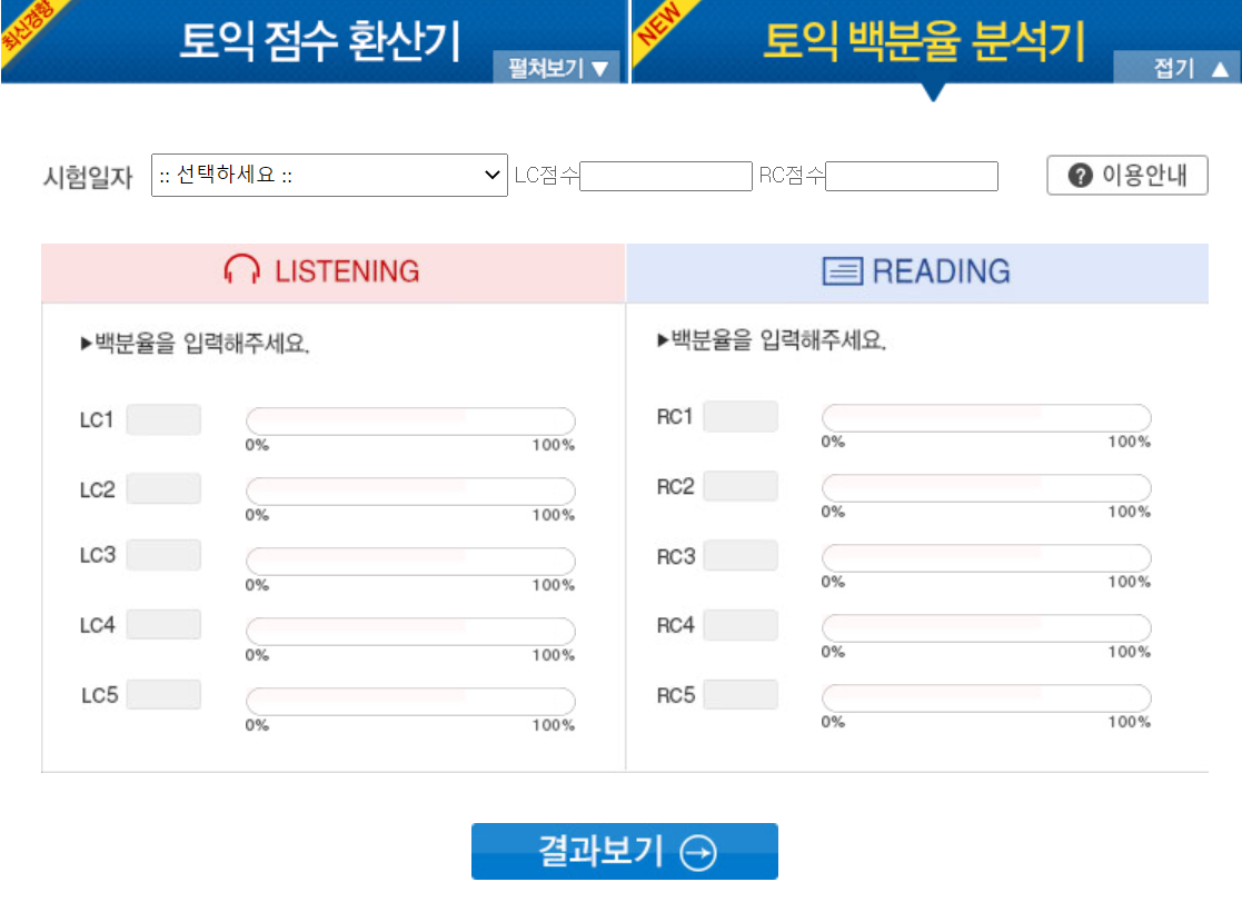 위 사이트는 토익 점수 환산기 링크입니다. 토익 시험 응시 준비자 및 응시자들은 유용하게 이용하시길 바랍니다. 감사합니다.